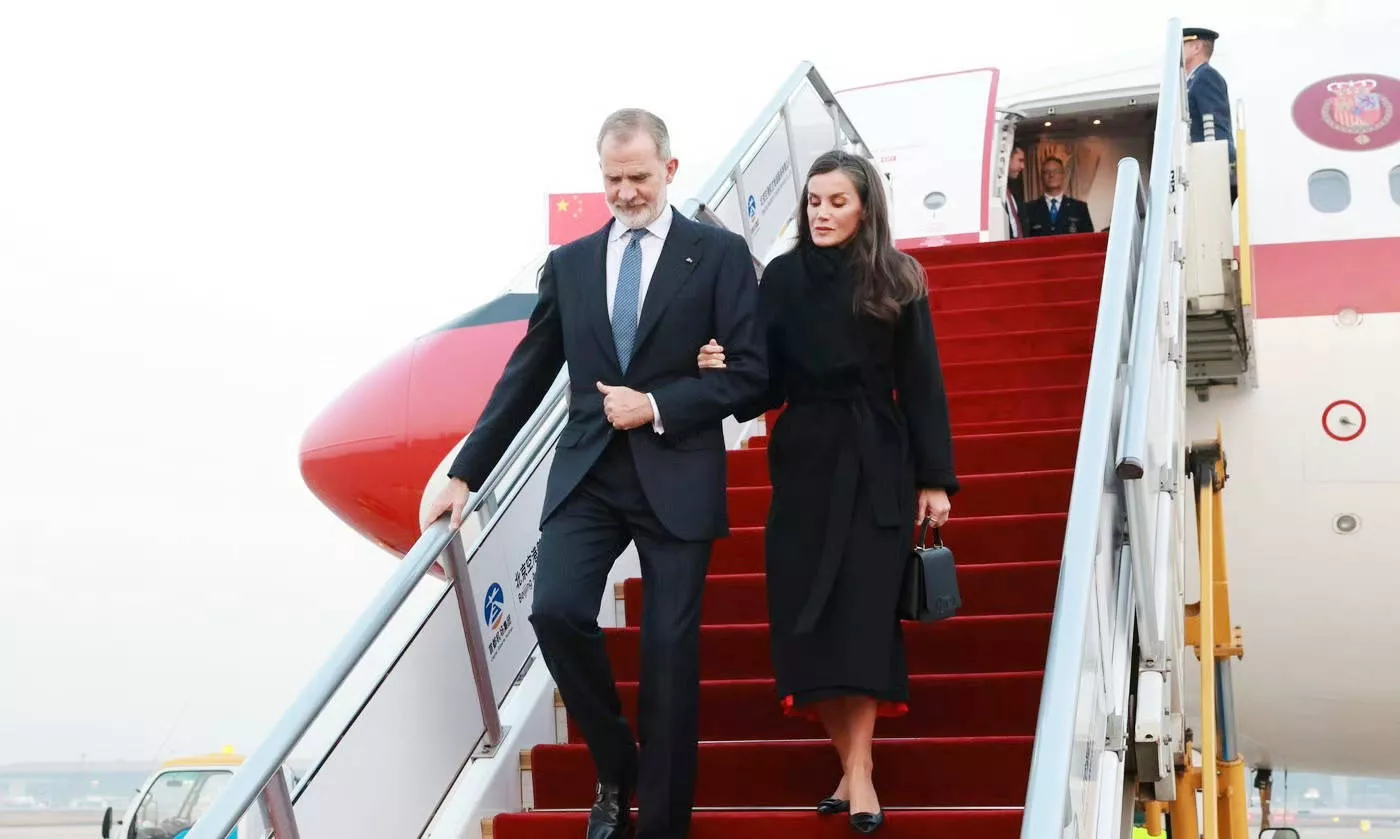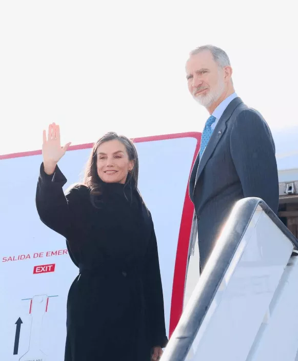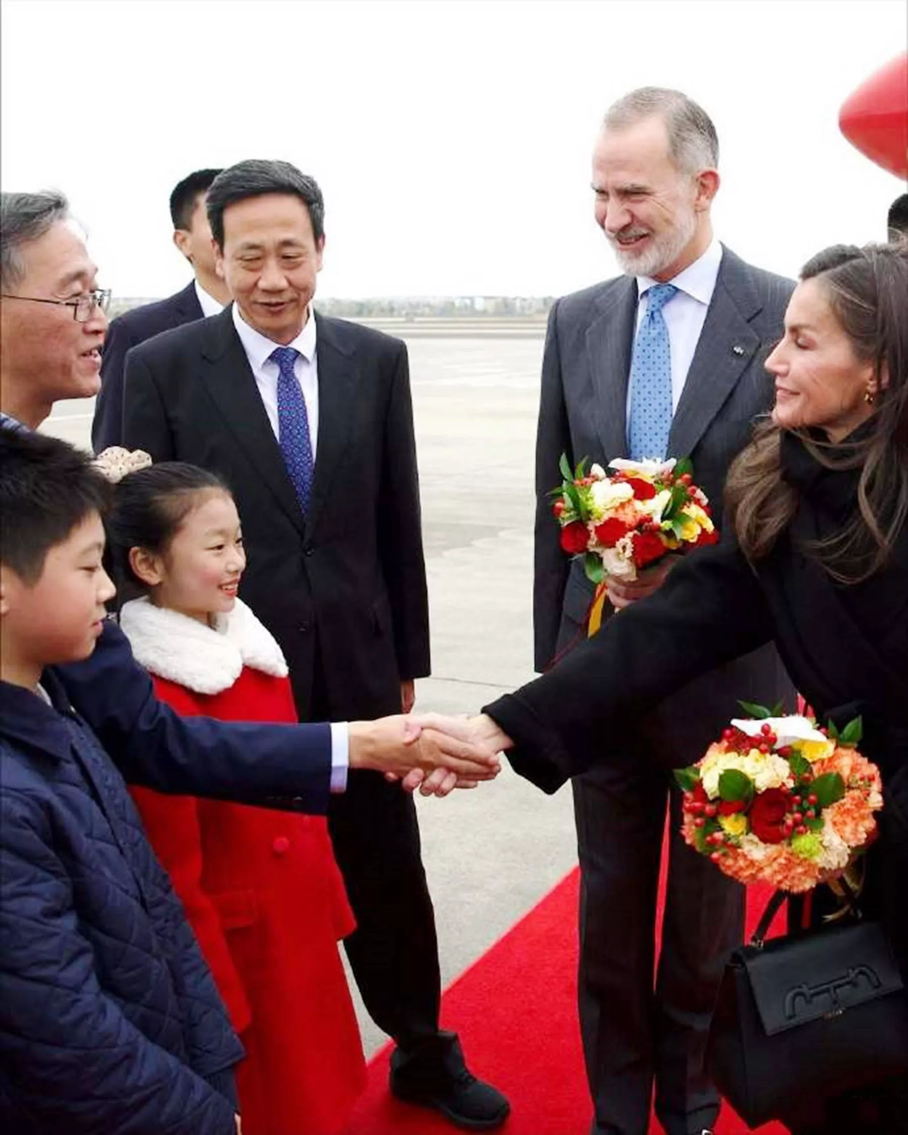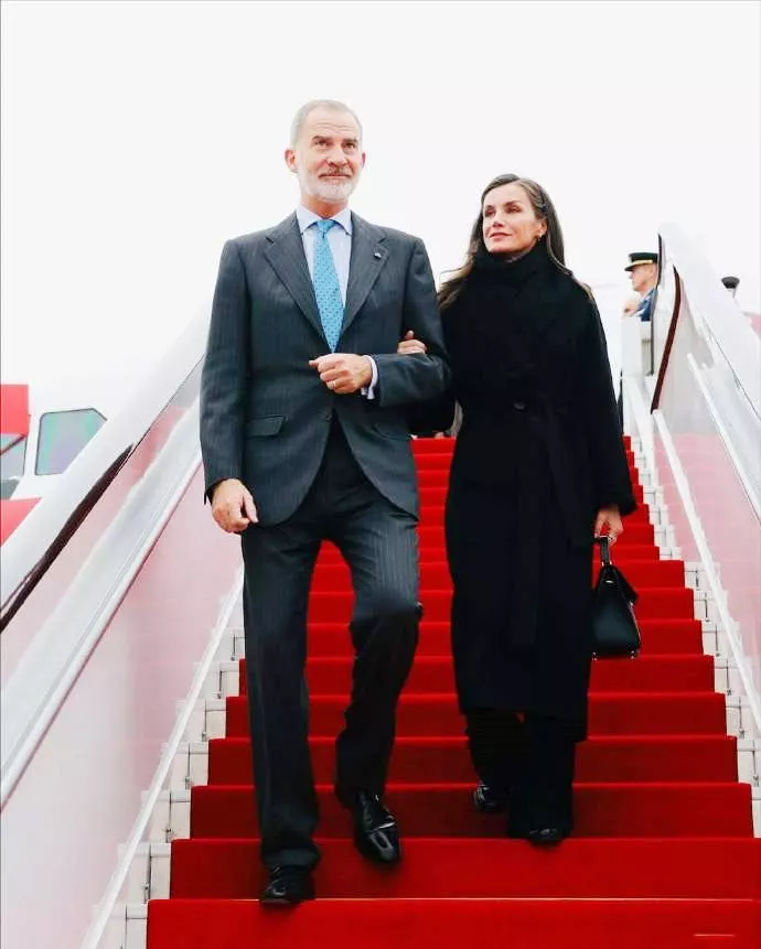 日的成都机场,阳光正好。费利佩国王与莱蒂西娅王后走下舷梯时,指尖相扣的瞬间,成了镜头里最温暖的注脚——他们没有更换出发时的造型,国王的黑色西装笔挺依旧,王后的深色大衣优雅如初,这份
