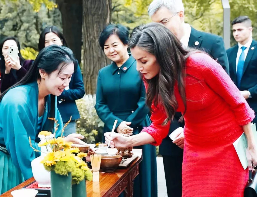 周年的活动,没有喧嚣的仪式,只有茶香与诗声交织。当茶艺师端来盖碗茶,王后低头垂眸学习点茶的模样,宛如一幅静止的油画 ——