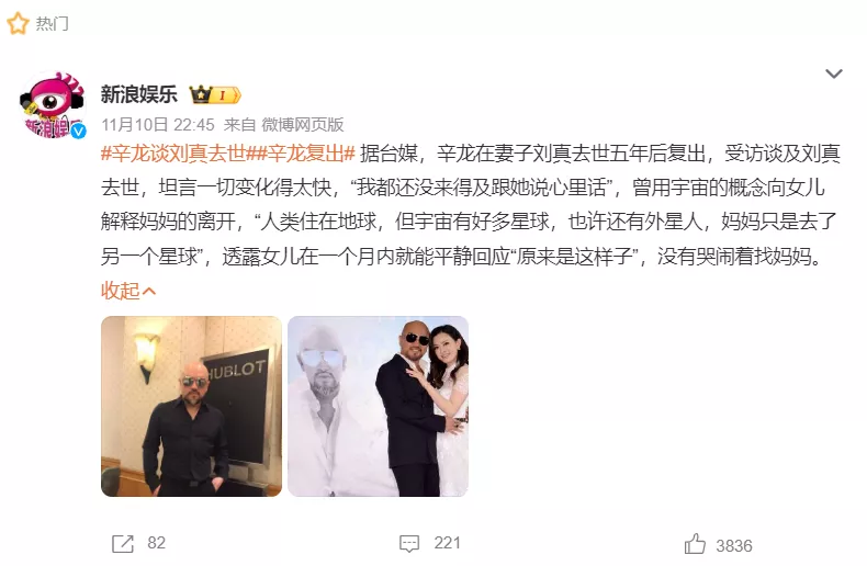辛龙于2020年痛失爱妻刘真后,工作全面停摆,近年来鲜少公开露面,只有每年刘真去世周年时发布社交动态悼念亡妻。