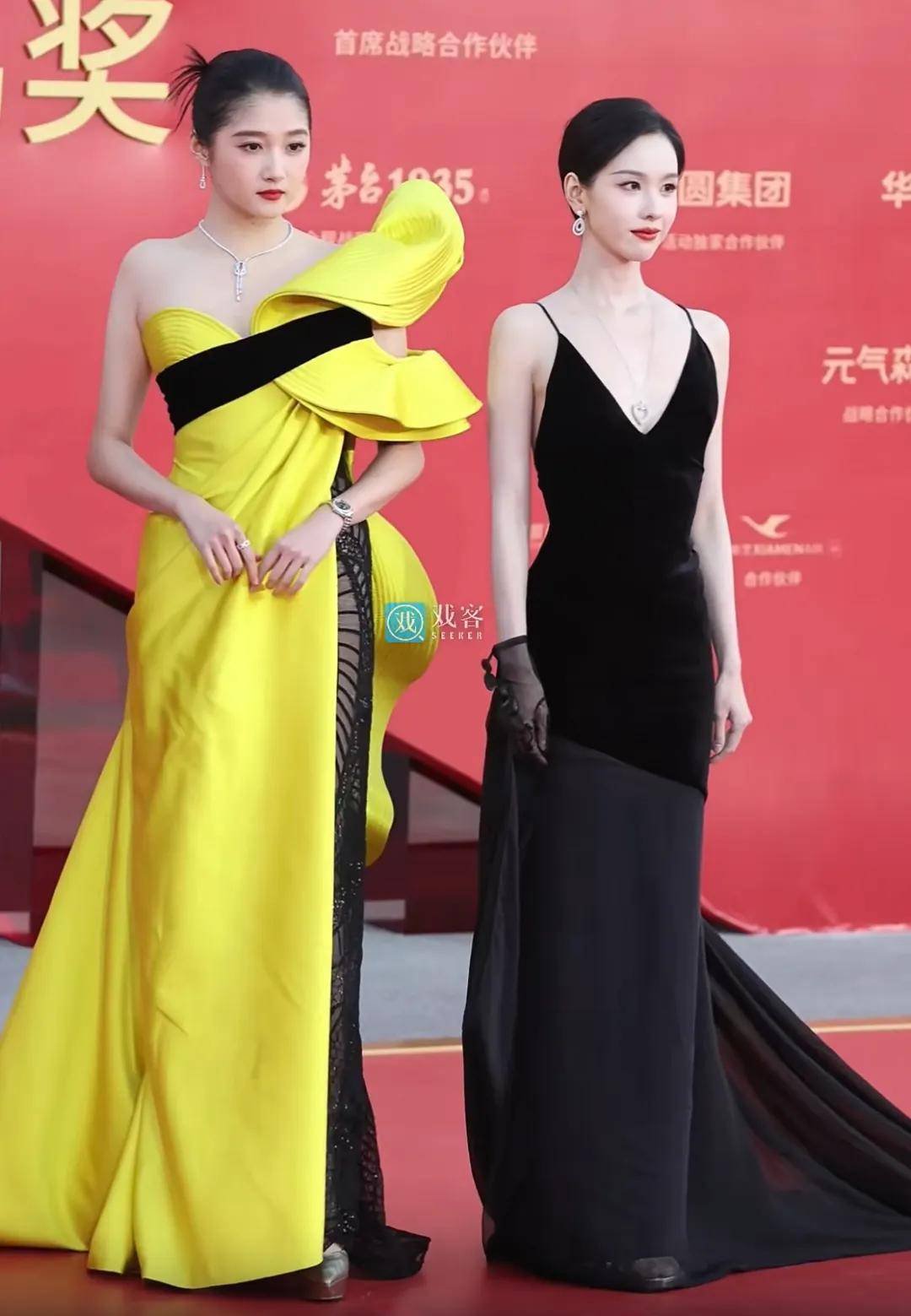 不知道是关晓彤还是她的造型师最终拍板了这条黄黑色拼接斜肩礼服,虽然她适合御姐风的打扮,但这条裙子搭配大红唇对她而言过于成熟了,给人一种小女生偷穿妈妈衣服的既视感。穿了黑色吊带V领长裙的陈都灵倒是让人有惊喜,黑裙配红唇足够经典又能凸显美貌。关晓彤这次跟陈都灵同框,毫无疑问被艳压了。