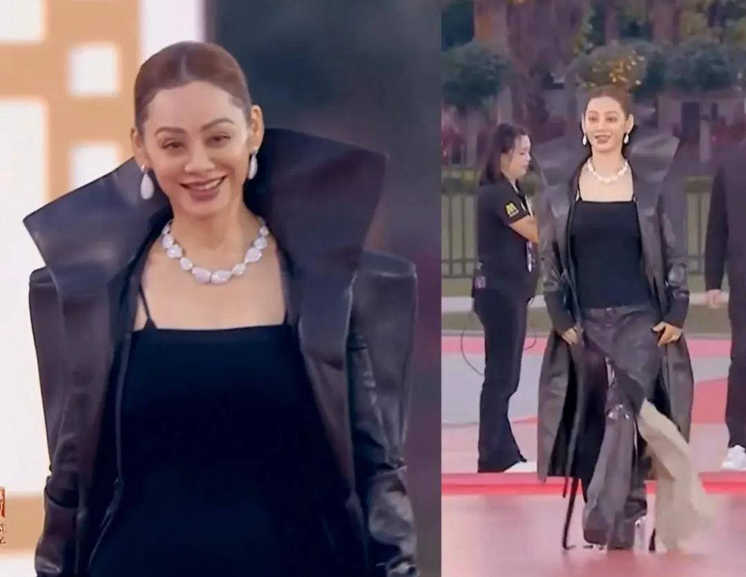 比叶童稍年长一点的惠英红,选择了一套新中式刺绣礼服,这一套更有秋冬的感觉,看着比较保暖。