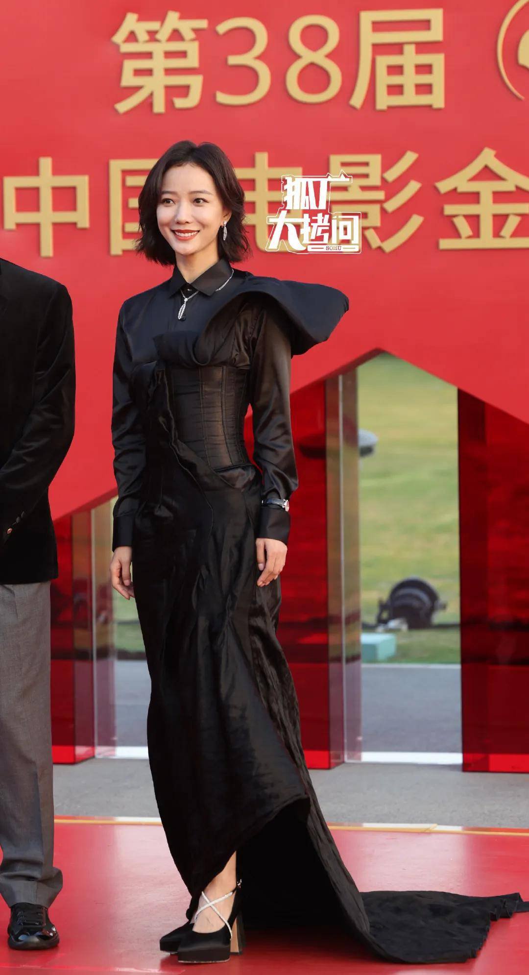 蒋梦婕选了一条金色纱裙,金色可以理解为呼应金鸡奖,但这套礼服的画风更适合出现在沙漠上,自带一点异域风情。