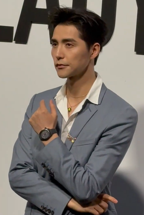 蓝灰色西装配白衬衫,整个人散发着成熟的魅力,珠宝项链与腕表两种风格,却被阿云嘎表现得格外高级。