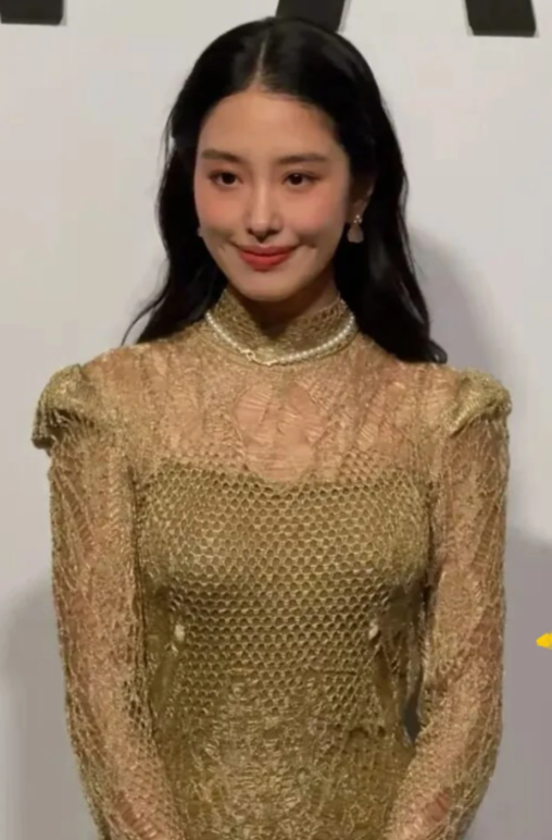 这次选择的金色蕾丝镂空礼服,优雅又奢华,披发配珍珠项链更是将她的优势发挥得淋漓尽致。