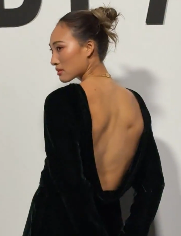 露背深V,恰好将郑钦文常年运动练就的线条,完全展现在镜头前。