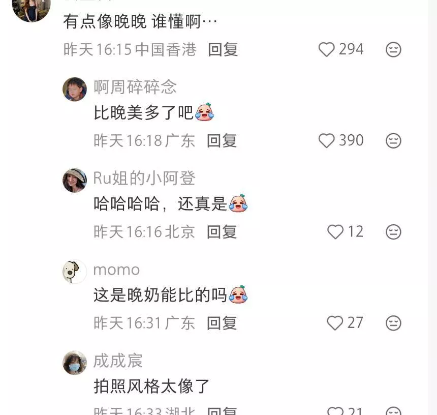 晚晚本来在网友心中的风评就不太好,所以看何穗与她的风格相撞,让人觉得怪怪的,还引起了一场到底谁在模仿谁的争执。