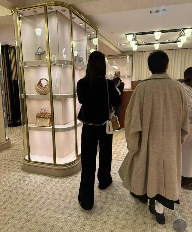 、黑色鞋子。她手里拿着一件白色毛茸茸外套,眼睛看着专柜里的爱马仕包。仔细看发现,她的气质很好。