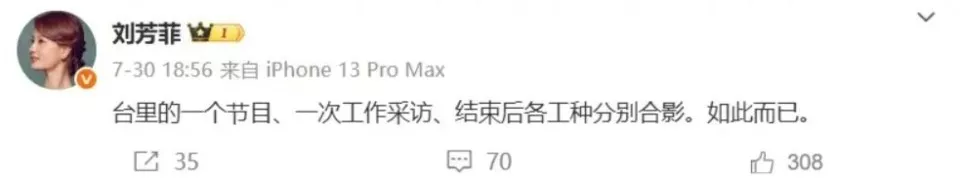 她发文表示,只是一个台里的节目一次采访,结束后各工种分别合影。