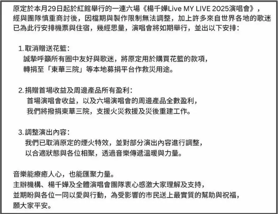 可是照常举办演唱会又过于冷漠,还好,杨千嬅并非毫无作为,演唱会主办方发布公告,确认杨千嬅演唱会如期举行,同时强调会取消花篮和烟花表演,同时会把首场演唱会收益和六场演唱会周边的盈利全部捐献出去,用于火灾支援和灾后重建工作。
