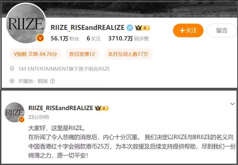 SM公司旗下男团RIIZE也成了第一个为香港火灾捐款的韩国组合,以组合和粉丝名义捐出25万港币,和SM公司加在一起差不多捐款110万人民币。
