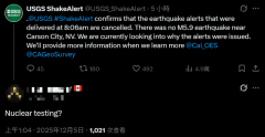美国地质调查局(USGS)稍早称,美国内华达州北部于当地时间4日上午传出发生规模5.9地震,但随后USGS又取消该次警报,引发网友热议。(图撷自X) 美国地质调查局(USGS)稍早称,美...