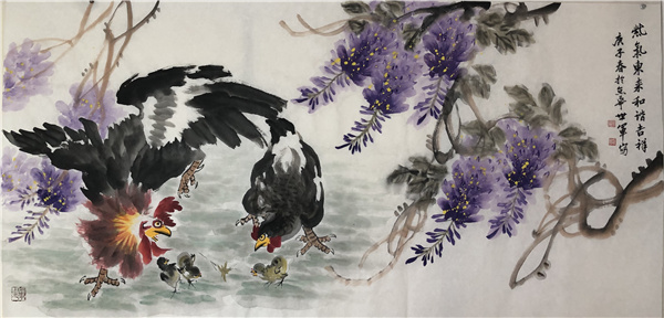 王先生作画,题材广泛,博涉多优,尤其以画雄鸡、紫藤寄寓吉祥而闻名遐迩!能够在画史为自己的艺术造诣赢得重要坐标,不能依靠普通的画题作证!唯有专题专享、独门独技方可以功传春秋,古今相望。比如郑板桥画竹、齐白石画虾都是这种情况。当下,王世军先生以独树一帜的紫藤图雄鸡图,作出了亘古未见的大功勋,成为盛世雄鸡创作的第一笔!也贵有引涉紫气东来的玄机功夫!