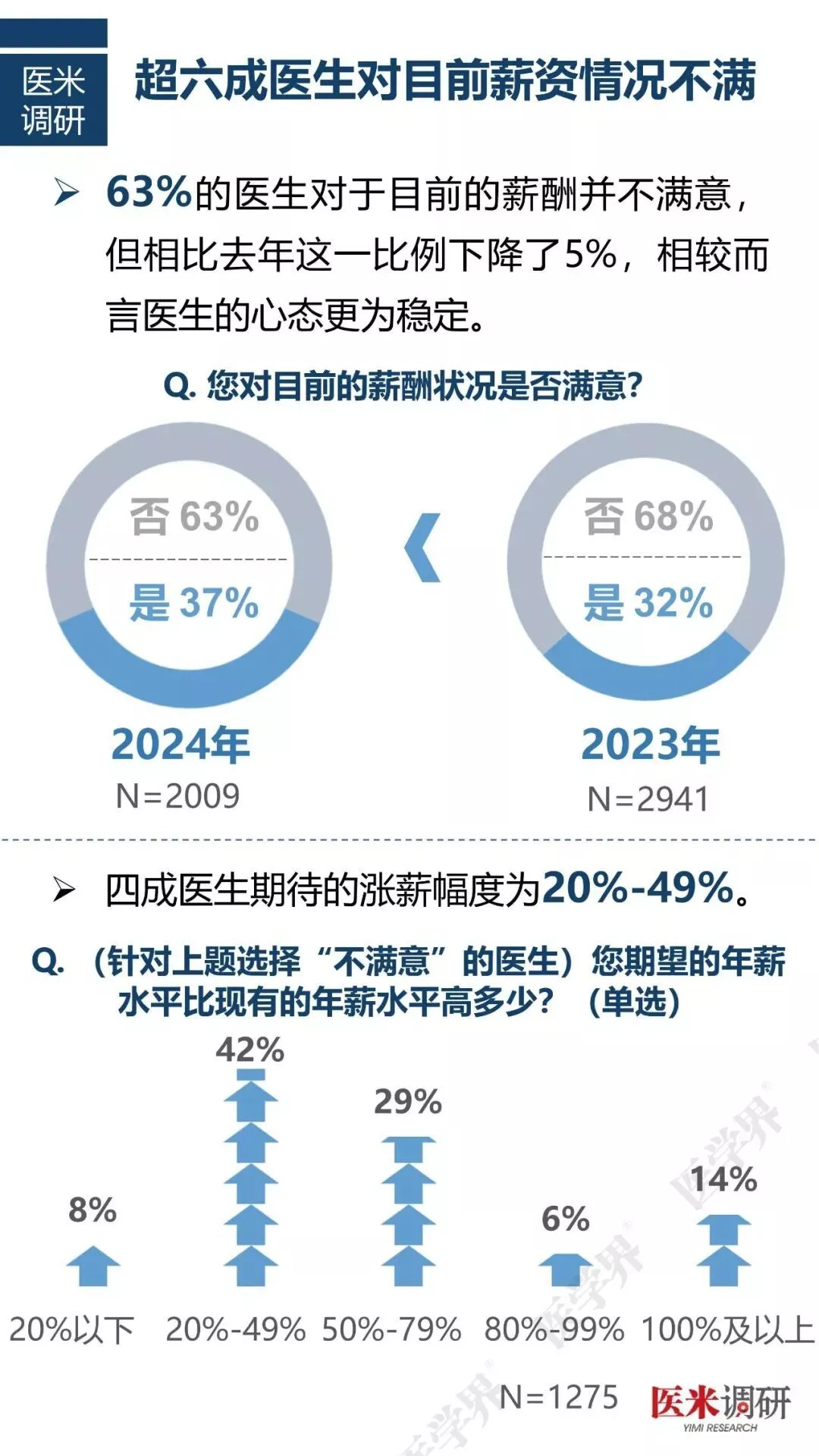 更早前,医学界和医米调研发布的《2024年度中国医院人力资源现状调研报告》显示,2009名参与调研的医生中,降薪的医生比例从2023年的50%增加到57%。