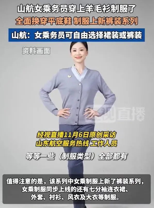 近日,有网友发帖称,山东航空的空乘穿上了毛衣开衫,并且空乘可以“自己决定穿什么”,同一航班空乘的穿着并不完全相同。
