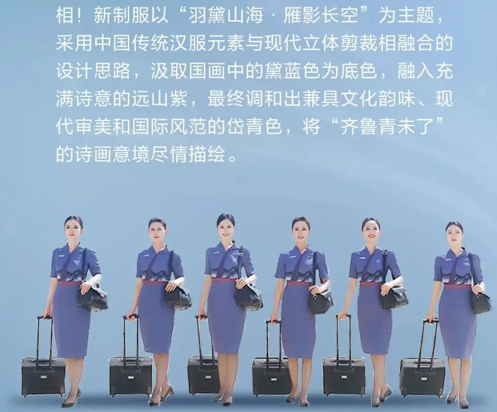 据了解,自今年7月26日山东航空发布新制服裙装后,又于10月初全面启用“青未了”系列空勤制服。