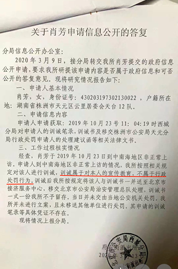 湖南株洲的肖芳因强拆问题多次上访,被以寻衅滋事罪判刑一年半。北京市公安局西城分局府右街派出所在对申请信息公开的答复中称,“训诫属于对本人的宣传教育,不属于行政处罚。”