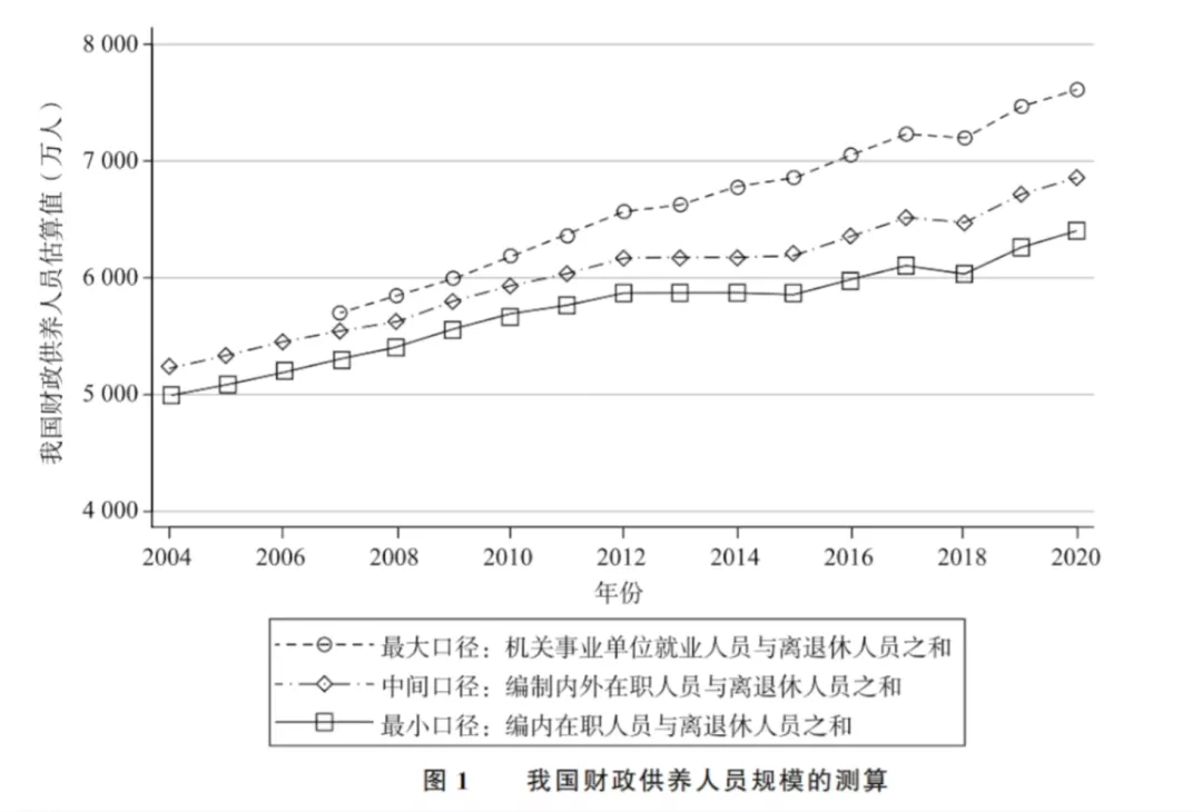 好在,最近复旦大学的三位学者(张军、马欣榕、刘志阔)发表了一篇研究报告,他们从各种官方统计的犄角旮旯里搜集数据,估算出了中国财政供养人员的真实规模和结构,总算填补了这些年的数据空白。