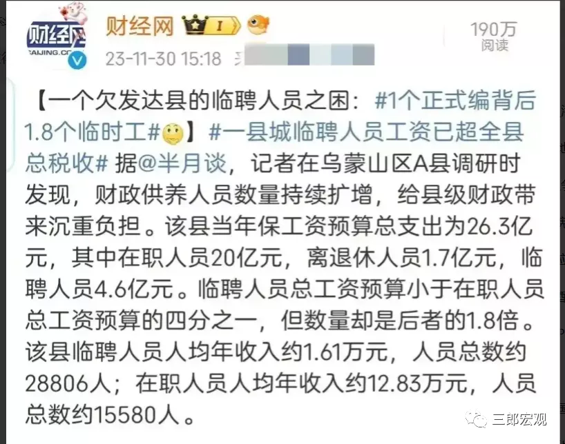 我们总听人说“财政负担重”,一个县城要养多少“吃财政饭”的人。
