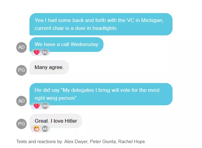 在另一段聊天中,堪萨斯州主席德怀尔告诉朱恩塔,密歇根青年共和党成员承诺“将投票给最右翼的人”。