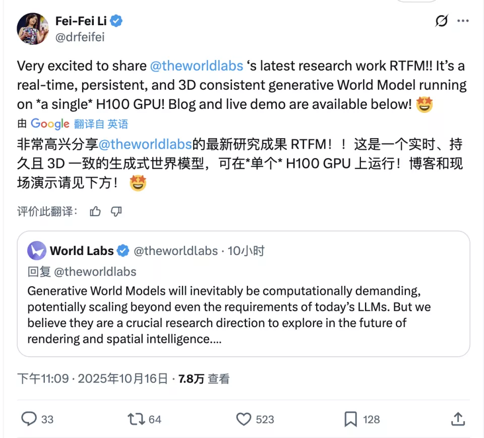 10月17日消息,李飞飞的World Labs于今晨发布全新实时生成式世界模型——RTFM(Real-Time