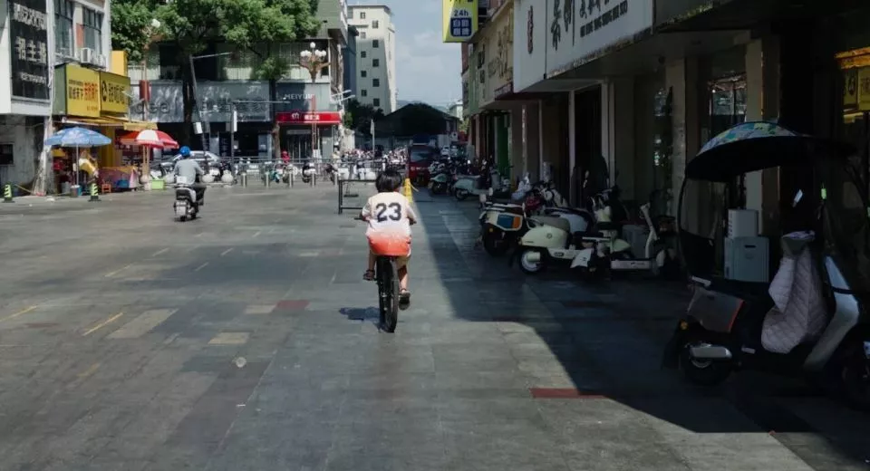 万年县的商业街上,一名小学生正骑车经过