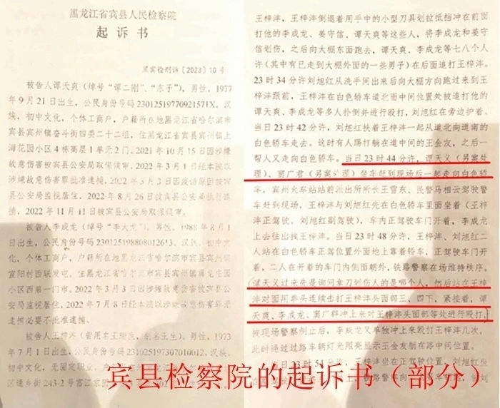 对于此案,宾县检察院起诉书(黑宾检刑诉【2023】10号)是这样认定的:殴打王梓沣的谭天爽、李成龙应以故意伤害罪追究其刑事责任。因二人认罪认罚且与王梓沣达成和解并取得谅解,建议判处谭天爽、李成龙八个月有期徒刑,依法适用缓刑;对殴打王梓沣的窦广君及人大代表谭天义另案处理(至今未被追究);王梓沣应以寻衅滋事罪、危险驾驶罪追究其刑事责任。王梓沣系在被他人追打情况下使用小型刀具划拉抵挡他人殴打具有自卫性,造成一人轻伤不能认定随意殴打他人;其认罪认罚,与被害人等人达成和解进行民事赔偿并取得谅解,可以从宽处罚,建议判处寻衅滋事罪七个月有期徒刑,依法适用缓刑;其危险驾驶系在被多人连续殴打多次心理产生极度恐惧怕再次挨打情况下将车开走,主观恶性不大,行使距离较短,人身危险性不大,没有造成危害后果,与其他危险驾驶行为有所区别,可以从宽处罚;其认罪认罚,建议判处危险驾驶罪五个月拘役,依法适用缓刑,并处罚金人民币16,000元。