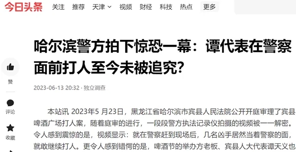 本站讯 2023年5 月23日,黑龙江省哈尔滨市宾县人民法院公开开庭审理了宾县啤酒广场打人案,随着庭审的进行,一段段警方执法记录仪拍摄的视频被一一解密。令人感到震惊的是,视频显示:就在警察赶到现场后,几名凶手居然当着警察的面,就敢继续打人。更令人感到错愕的是,啤酒节的举办方老板、宾县人大代表谭天义也在打人者行列之中,并且检方已经认定其参与打人,至今却未被追究刑事责任。庭审被解密的多份视频,看后直让人脊背发凉!