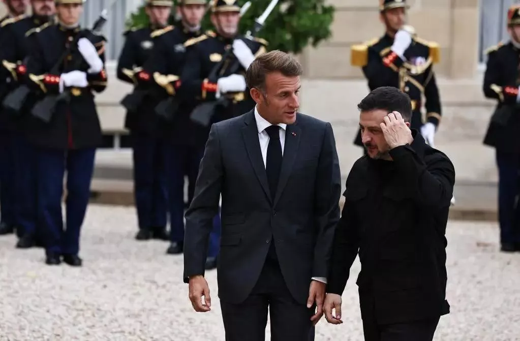 9月3日,在法国巴黎总统府爱丽舍宫,法国总统马克龙(左)迎接来访的乌克兰总统泽连斯基。新华社记者高静摄