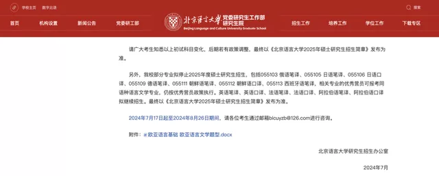 ▲ 北京语言大学在2025年度硕士招生中停止7个翻译专业的招生。图 / 北京语言大学官网截图