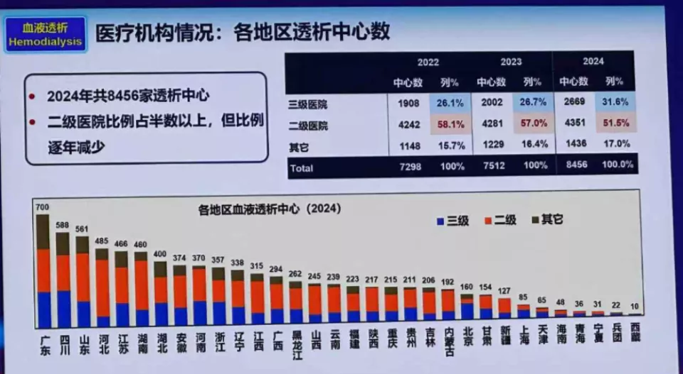 据2024年中国肾脏病数据登记系统数据,广东省的透析中心数量为全国第一/图源:中国非公医协肾脏病透析专委会