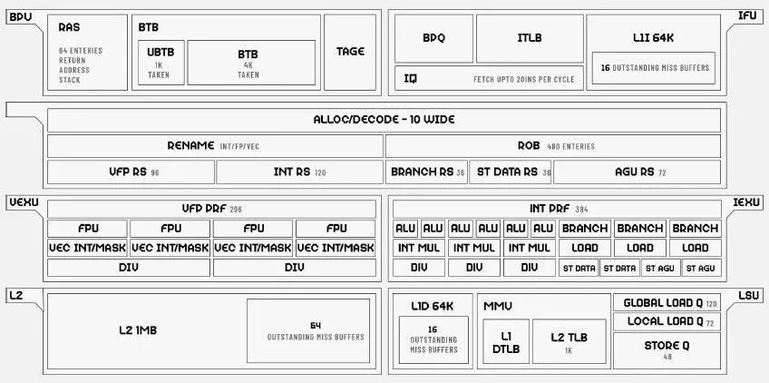 宽的发射管道、480 条目的重新排序缓冲区,支持 16 条缩放器指令,并集成四个 128 位矢量单元用于单指令多数据 (SIMD)
