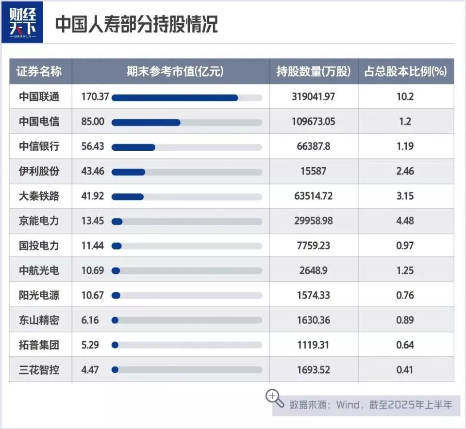 从高到低看,中国联通、中国电信、中信银行、伊利股份、大秦铁路位列中国人寿持仓市值TOP5,中国人寿对几家公司的持有参考市值在40亿到170亿元之间。