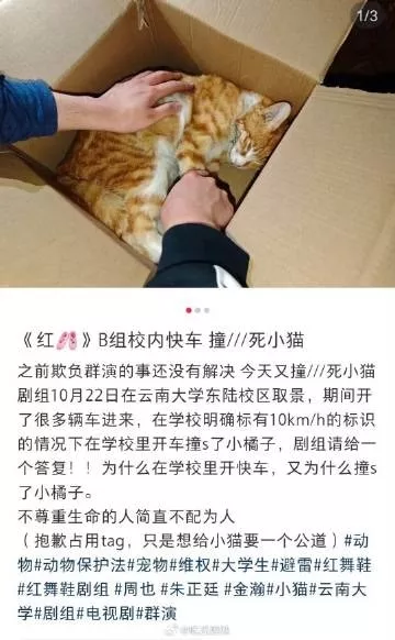 云南大学网红流浪猫“小橘子”因一场拍摄意外丧命,让学生们陷入无尽悲伤。《红舞鞋》剧组22日在校内取景拍摄时,车辆误撞小橘子身亡,引起学生们舆论挞伐。该剧组于隔日凌晨发表道歉声明称,司机“疏忽未察觉车旁小动物”,然而,也有学生质疑,真正原因是剧组车辆在校园内超速行驶,要求学校与警方调查真相。