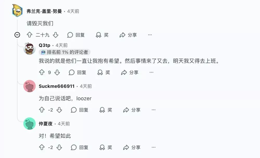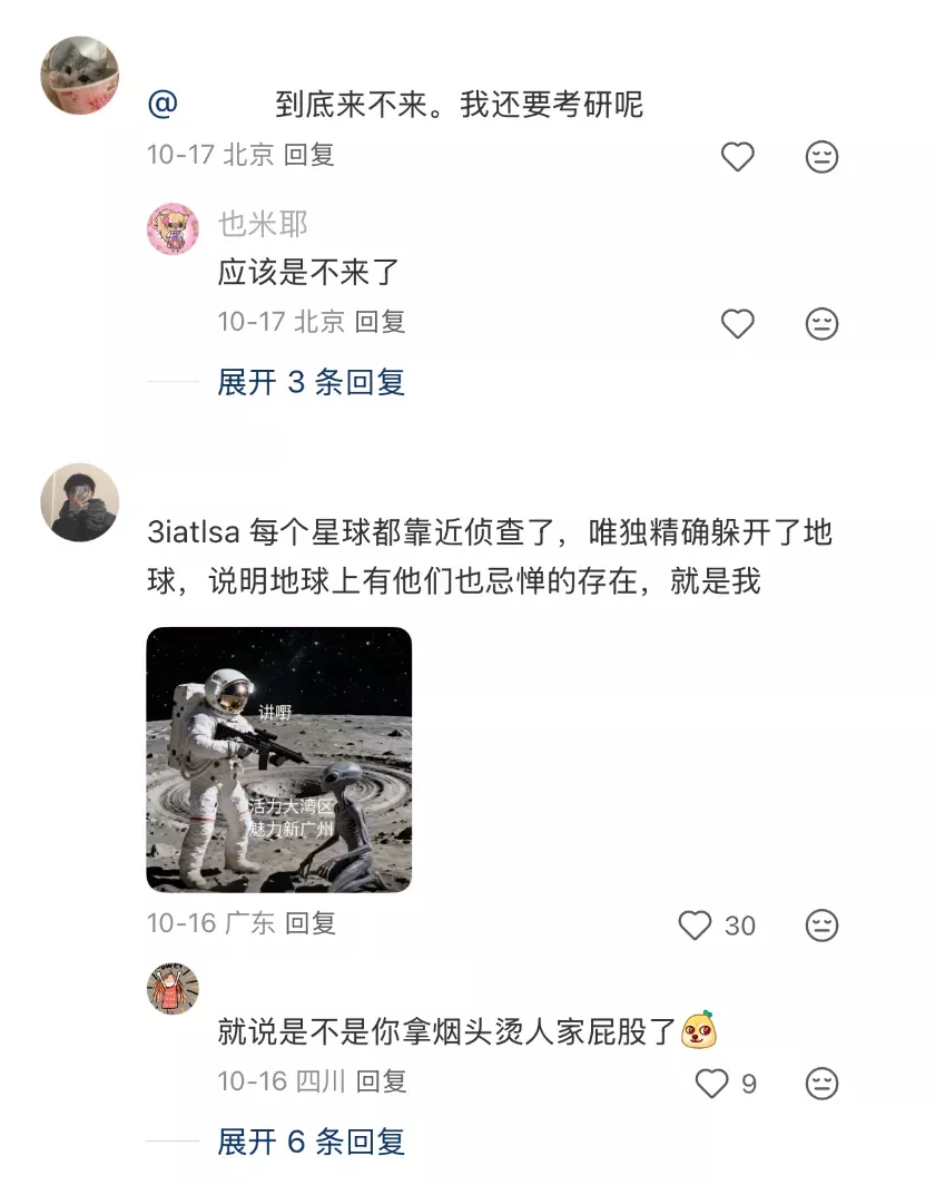 无论是国内外,无论3I/ATLAS到底是几艘飞船,大部分人都有一个共同的念头:只要它是来要毁灭地球的就欢迎。还有人在社媒上祈祷:别瞎给我希望,要来就快来吧!