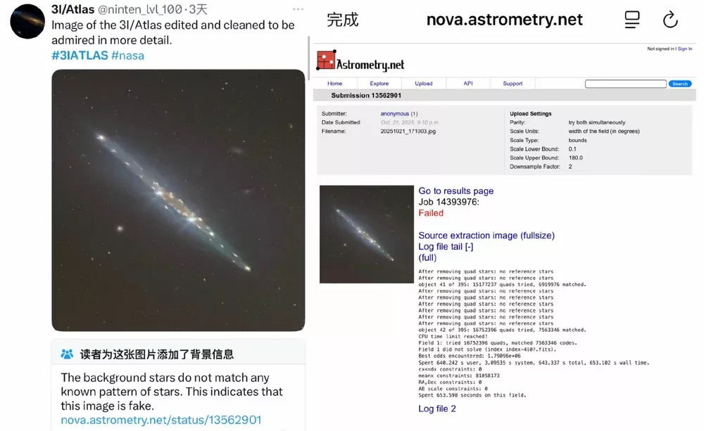 不过,现在在互联网上流传的3I/ATLAS的图片,都一一被证明是Ai合成的假图。连专门播报3I/ATLAS的博主@ninten_lvl_100在自己的帖子下把验证网站都贴上了验伪网站。