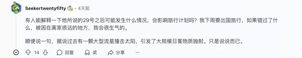 “有人能解释他是在暗示29号之后可能发生什么,会影响旅行计划吗?我下周出国,万一我错过了什么又被困在外面,就真要炸了。”