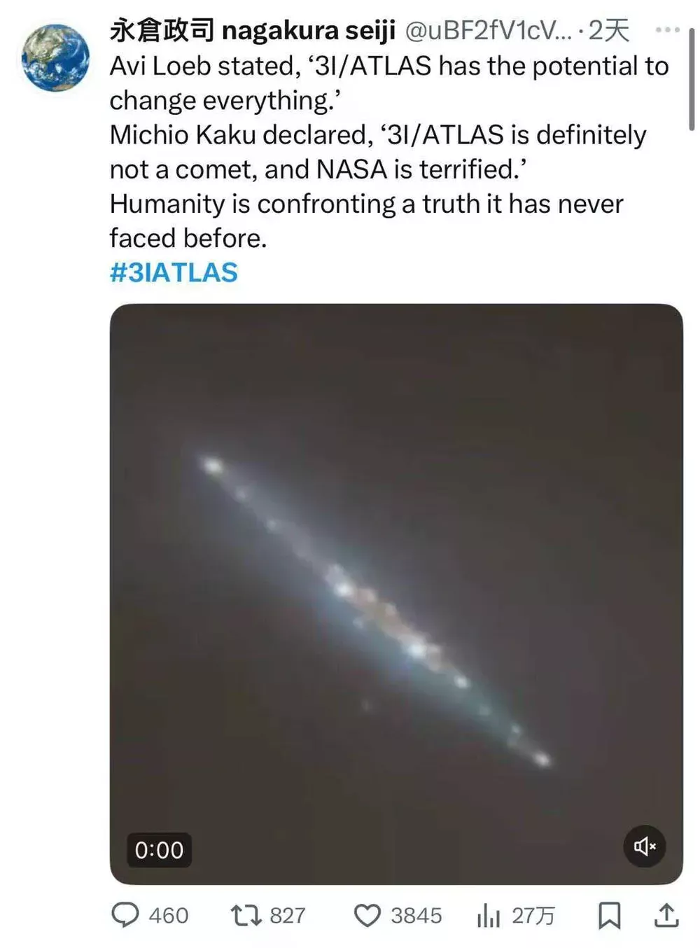此视频一出,就成了这几天来最热门的推文之一。正因为它像素低且时长短,人们纷纷把它当成了3I/ATLAS的最新形态。