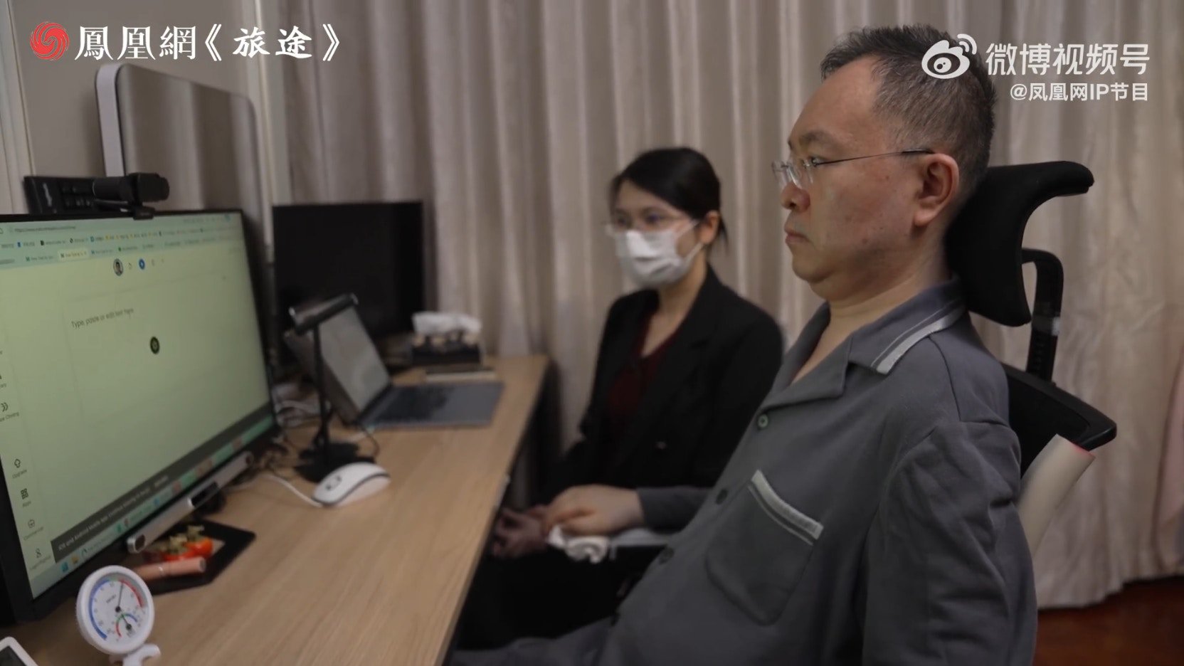 在採访中,蔡磊利用眼控仪表示,“自己依然是全天工作,从早上8、9时开始,到晚上11至12时,坚持办公两个小时左右,必须马上躺下拍打身体,否则一直疼,神经压迫疼痛,没有肌肉缓冲,皮肤也特别疼,会有压疮”。