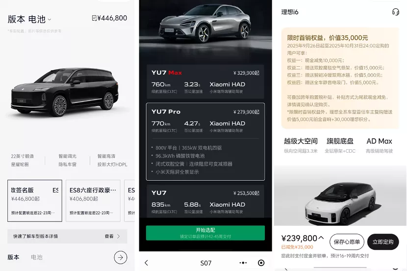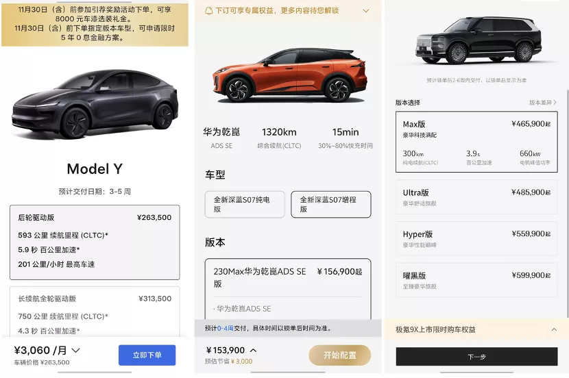 Y后驱版目前提车周期3-5周,现在下单丝毫不影响年底提车。而像深蓝S07、极氪9X等车型,官方小程序显示的提车周期分别为0-4周和2-6周,理论上也不影响用户享受到购置税全免的福利。