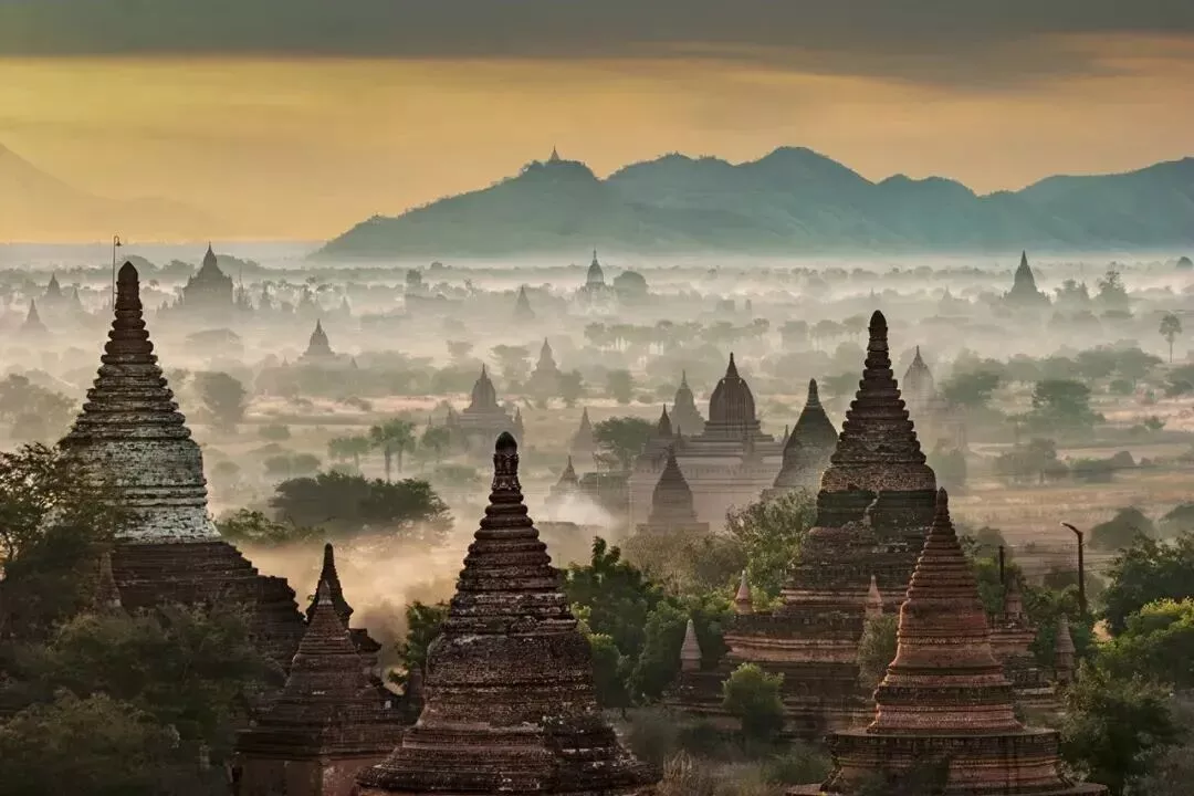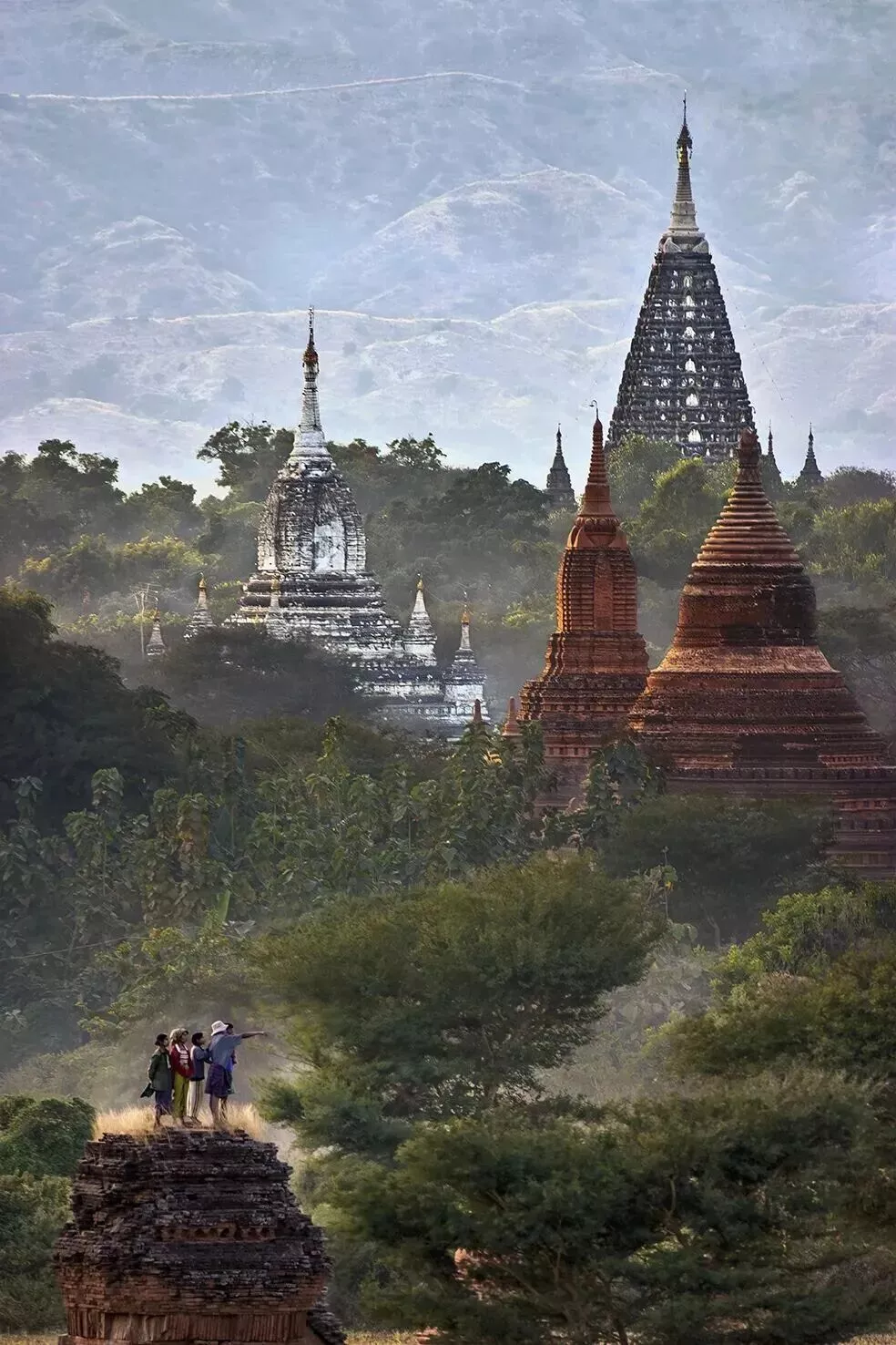 “千佛之都”蒲甘的佛塔群像,处在清晨的薄雾中,或者是落日的馀晖中,运用了多种层次的手法,散发着近似水墨画的意境,灿烂而辉煌。