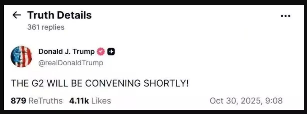 川普第二次当选上任以来至少两次提到的“G2”世界。第一次是在今年入主白宫后不久,他当时说,中美合作可以搞定世界上绝大部分事情(当时还没有直接说G2)。第二次是在韩国釜山会晤之前,这次川普说的更为直白,而且全部是用大写字母:“THE