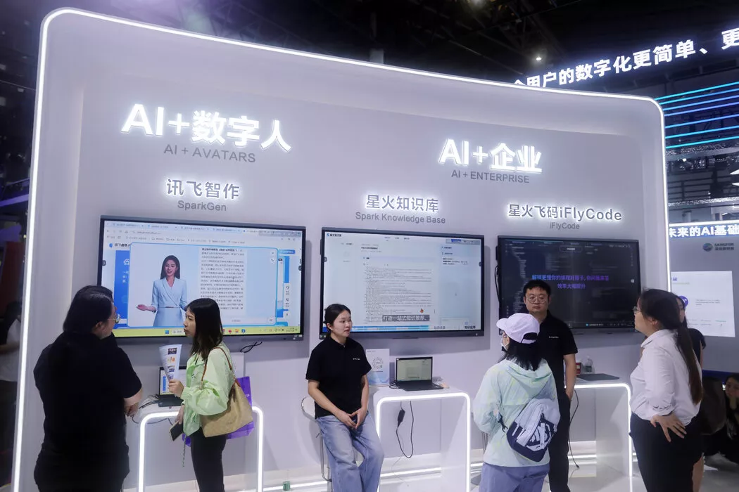 7月,上海一个展会上科大讯飞人工智能模型的展位。人权组织指控科大讯飞协助中国政府利用语音特征压制部分民众。