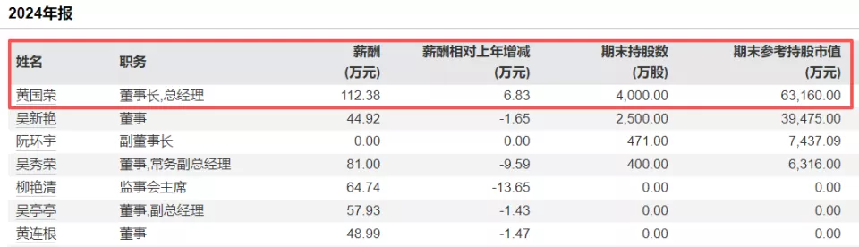 2024年年报显示,黄国荣年薪为112.38万元,吴新艳年薪为44.92万元。