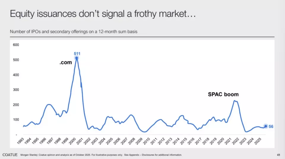 支撑这一判断的理由包括:头部企业的利润和现金流在中期内足以支撑其估值;2025年全球一级市场并未呈现失控式狂热(IPO仍处低位且分化明显),与历史泡沫顶峰时期截然不同;全民杠杆和过度融资也未达到极端程度。