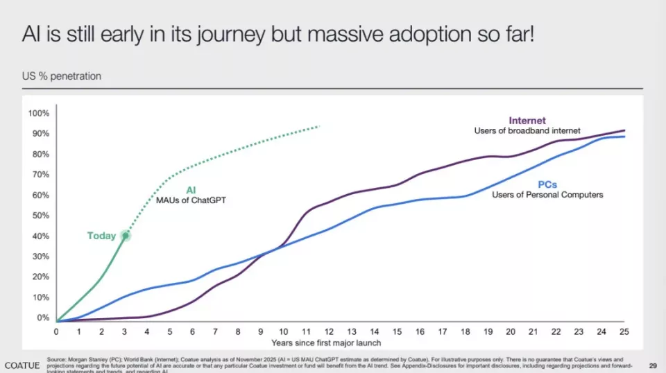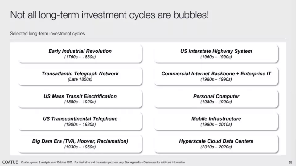 历史上,许多被认为是“泡沫”的现象——如互联网、电力、云计算——最终都演变成了长期存在的基础设施。Coatue认为,AI