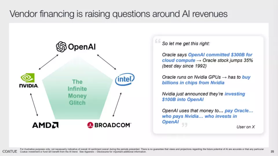 OpenAI、英伟达、甲骨文等公司正形成一种投资与支出相互推动的循环经济。Coatue戏称这是一种“无限金钱漏洞(Infinite