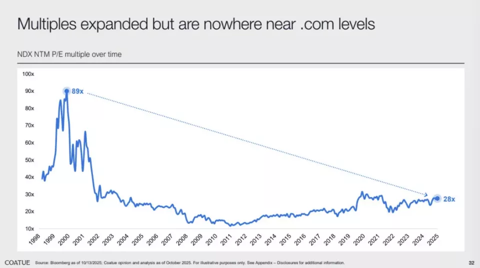 PE)在2025年仅为28倍,而在1999年互联网泡沫时期高达89倍。