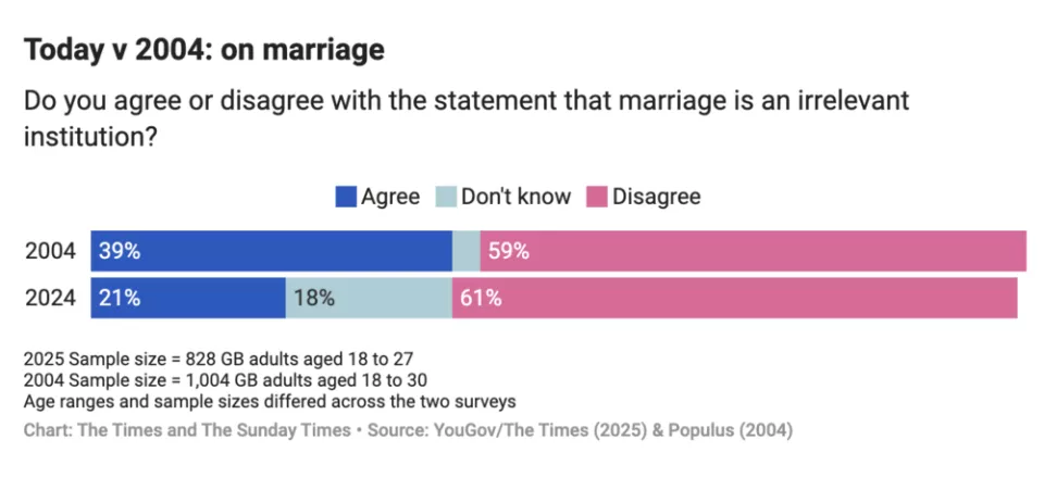 《泰晤士报》发现,21%的年轻一代认同婚姻无关紧要的观点。相比20年前,39%的千禧一代持相同观点,如今看来,人们对婚姻的接受度似乎正在提高。