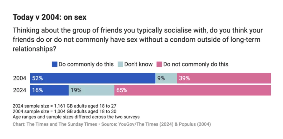 2025年,《泰晤士报》与YouGov合作,对1000多名年轻人进行了民意调查。调查结果显示,约62%的Z世代表示,他们不经常发生一夜情。只有约23%的人表示有过随意的性行为,这与《泰晤士报》在2004年对千禧一代的调查结果截然不同。当时,约19%的年轻人表示他们没有一夜情,而78%的人表示他们在第一次约会时就发生了性关系。