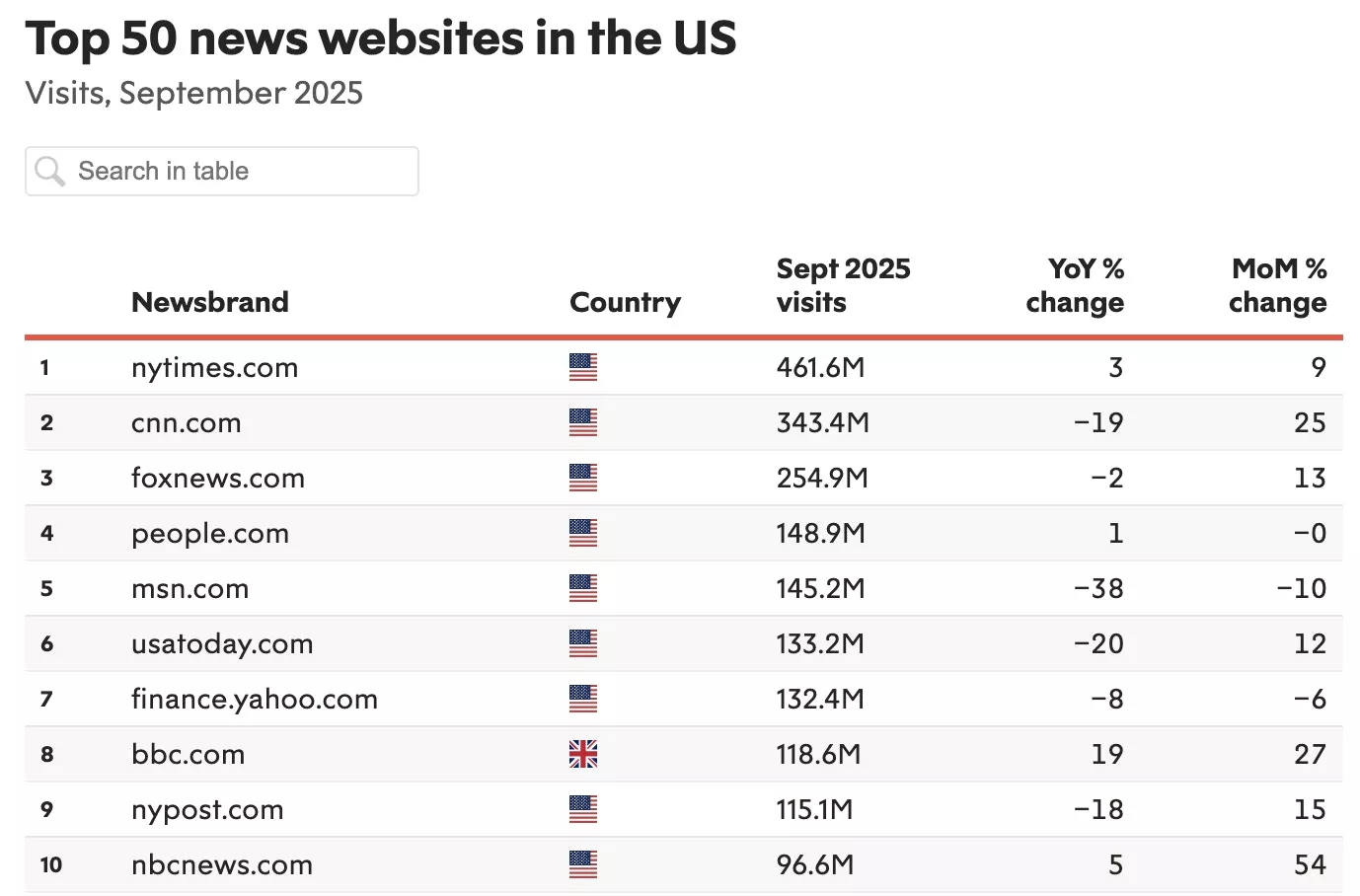根据2025年9月的数据,BBC是美国访客量排行第八的新闻网站,月访客量达1.18亿,是前十名中唯一一个外国新闻机构。(pressgazette)